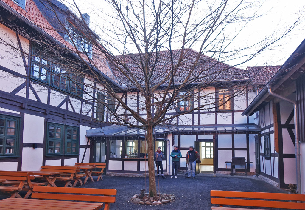 Kimberley Schröder zeigte uns den ebenfalls in Herzberg am Harz gelegenen Deutschen Kaiser und führt uns durch ein geschichtsträchtiges Fachwerkgebäude. Schon die Eingangstür zum Gasthaus und die dahinterliegende Diele mit der imposanten Eichentreppe waren ein besonderer Blickfang. Ebenso eindrucksvoll war jedoch,mehr über die Geschichte des Deutschen Kaisers und was aus ihm geworden ist. Sowohl die Begehung der Innenräume als auch der Blick auf die Fachwerkfassaden, ob von der Fußgängerzone aus oder aus dem Innenhof des Gasthauses, machten klar, mit welcher Liebe zum Detail und dem Erhalt der alten Bausubstanz hier restauriert wurde.
